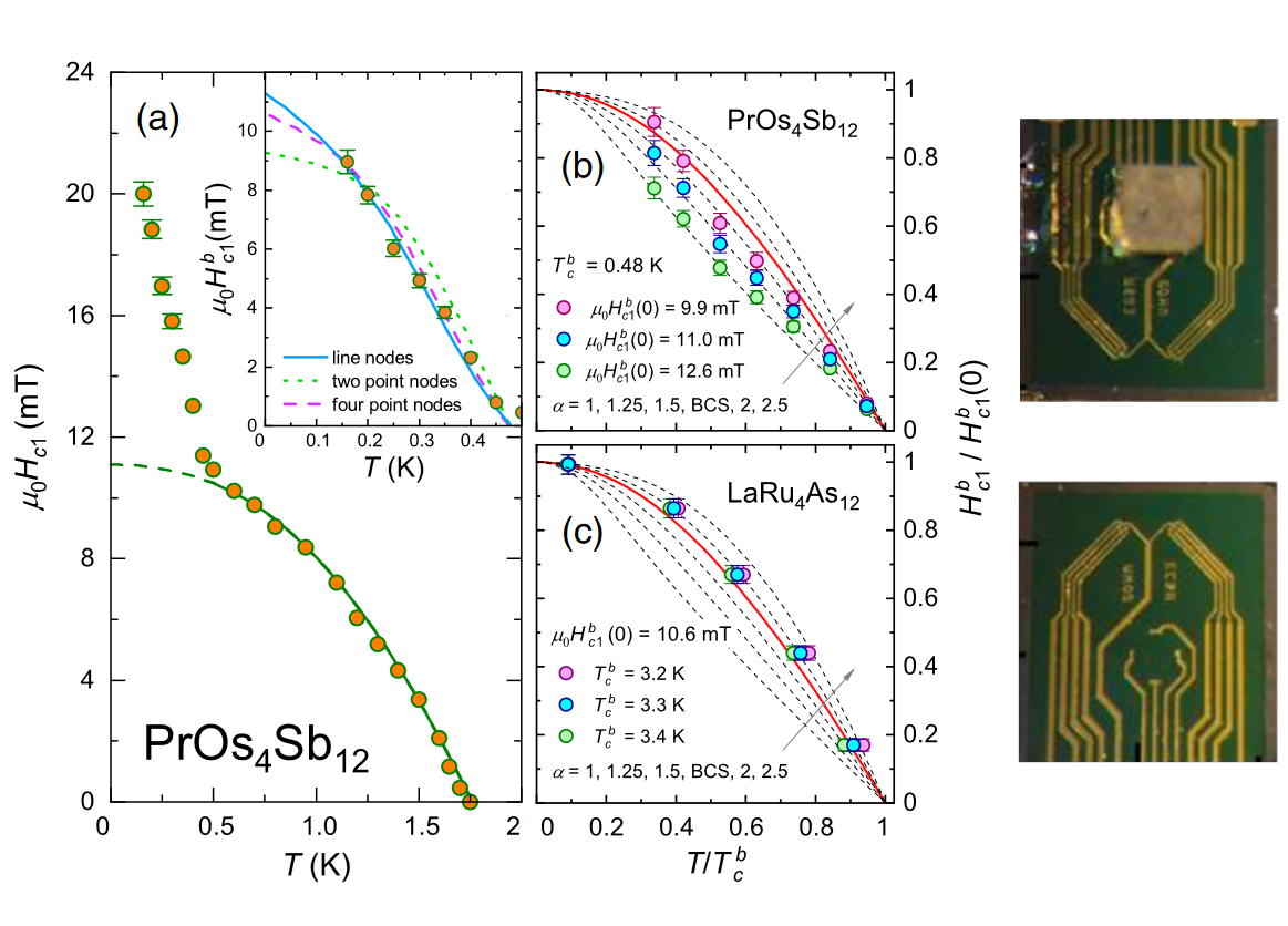 Uruchomiono stanowisko mikromagnetometrii hallowskiej w niskich temperaturach do 160 mK. Silne wzmocnienie dolnego pola krytycznego Hc1 głęboko w stanie nadprzewodzącym LaRu4As12 (Tc = 10.4 K) i PrOs4Sb12 (Tc = 1.85 K) wskazuje na rzadko spotykany efekt słabego sprzężenia międzypasmowego. Tylko dla ciężkofermionowego PrOs4Sb12 zaobserwowano linową zależność Hc1(T) w granicy T = 0, co sugeruje zmianę znaku nadprzewodzącego parametru porządku.